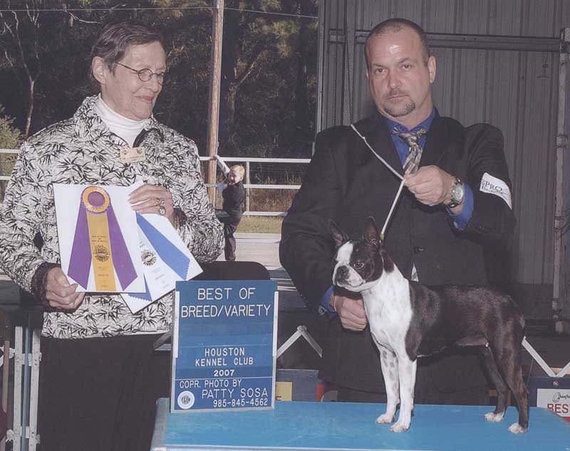 Me Me shown here by Rick Wilson, winning Best of Breed & 5 pt major over specials for her first win under the late judge Jacqueline Hungerland," A very nice bitch and one of the few I've seen these days that's not over-angulated."